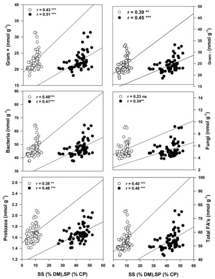 The microbial population was also observed to be significantly associated with the SP and SS contents in the forage (soybean and corn) produced as intercrops or monocultures (Figure 5). These significant relationships suggest for the first time that the active microbial population, particularly the protozoans and gram+ and gram− bacteria, appears to enhance the nutritive value of corn and soybean forage produced in podzols as either monocrops or intercrops in northern or cool climates.