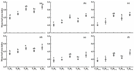 Mean leaf area index (MLAI) under different high-temperature treatments at booting, flowering, and combined stages during the 2016–2017 growing seasons. (a) Huaidao-5 at booting treatment; (b) Huaidao-5 at flowering treatment; (c) Huaidao-5 at combined stages treatment; (d) Wuyunjing-24 at booting treatment; (e) Wuyunjing-24 at flowering treatment; (f) Wuyunjing-24 at combined stages treatment. Different letters indicate significant differences at the 0.05 level. Vertical bars represent the standard deviation of the mean.