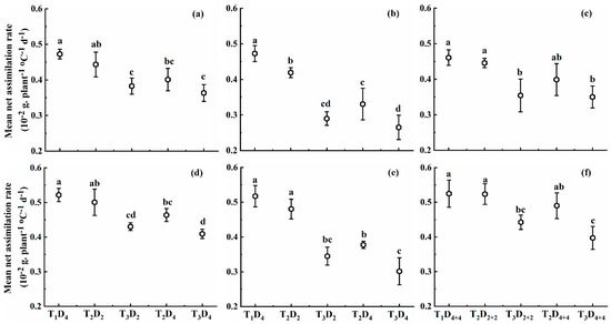 Mean net assimilation rate (MNAR) under different high-temperature treatments at booting, flowering, and combined stages during the 2016–2017 growing seasons. (a) Huaidao-5 at booting treatment; (b) Huaidao-5 at flowering treatment; (c) Huaidao-5 at combined stages treatment; (d) Wuyunjing-24 at booting treatment; (e) Wuyunjing-24 at flowering treatment; (f) Wuyunjing-24 at combined stages treatment. Different letters indicate significant differences at the 0.05 level. Vertical bars represent the standard deviation of the mean.