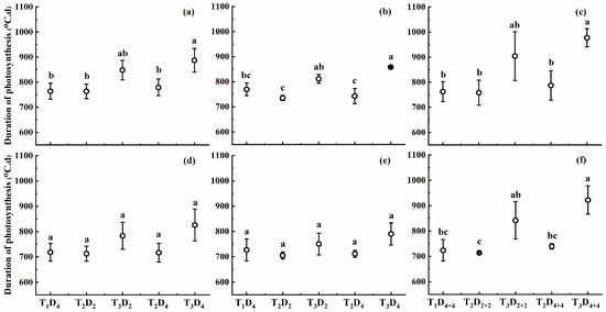 Duration of photosynthesis (DOP) under different high-temperature treatments at booting, flowering, and combined stages during the 2016–2017 growing seasons. (a) Huaidao-5 at booting treatment; (b) Huaidao-5 at flowering treatment; (c) Huaidao-5 at combined stages treatment; (d) Wuyunjing-24 at booting treatment; (e) Wuyunjing-24 at flowering treatment; (f) Wuyunjing-24 at combined stages treatment. Different letters indicate significant differences at the 0.05 level. Vertical bars represent the standard deviation of the mean.