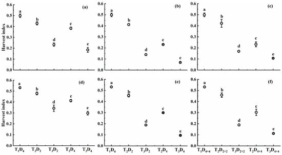 Harvest index (HI) under different high-temperature treatments at booting, flowering, and combined stages during the 2016–2017 growing seasons. (a) Huaidao-5 at booting treatment; (b) Huaidao-5 at flowering treatment; (c) Huaidao-5 at combined stages treatment; (d) Wuyunjing-24 at booting treatment; (e) Wuyunjing-24 at flowering treatment; (f) Wuyunjing-24 at combined stages treatment. Different letters indicate significant differences at the 0.05 level. Vertical bars represent the standard deviation of the mean.