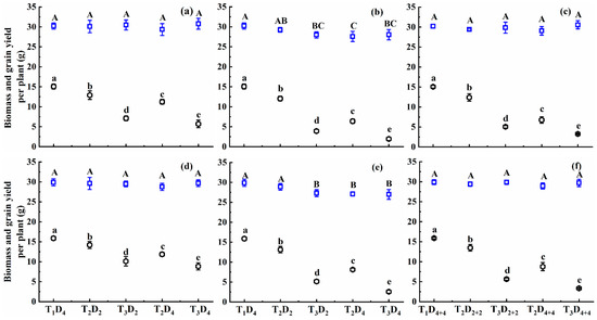 Biomass per plant at maturity (BPPM) and grain yield per plant (YPP) under different high-temperature treatments at booting, flowering, and combined stages during the 2016–2017 growing seasons. (a) Huaidao-5 at booting treatment; (b) Huaidao-5 at flowering treatment; (c) Huaidao-5 at combined stages treatment; (d) Wuyunjing-24 at booting treatment; (e) Wuyunjing-24 at flowering treatment; (f) Wuyunjing-24 at combined stages treatment. □ indicates BPPM and ⬡ indicates YPP. Different letters indicate significant differences at the 0.05 level. Vertical bars represent the standard deviation of the mean.
