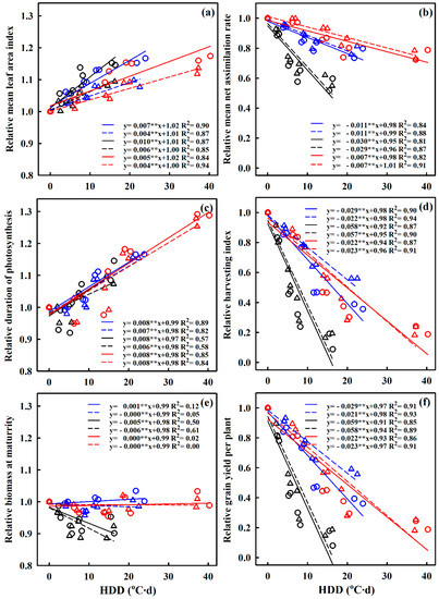 3.2. Relationships of HDD with Relative Biomass Production and Grain Yield
