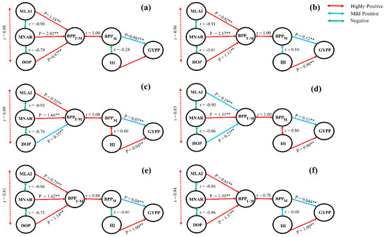 Path coefficient diagrams showing the interrelationships among grain yield per plant (YPP), biomass accumulation per plant at maturity (BPPM), harvest index (HI), biomass accumulation per plant from the first day of treatment to maturity (BPPT-M), mean leaf area index (MLAI), mean net assimilation rate (MNAR), and duration of photosynthesis (DOP) under high temperature at booting, flowering, and combined stages during the 2016–2017 growing seasons. In the diagram, single-headed arrows indicate path coefficients (P), and double-headed arrows indicate simple linear correlation coefficients (r). (a) Huaidao-5 at booting treatment; (b) Wuyunjing-24 at booting treatment; (c) Huaidao-5 at flowering treatment; (d) Wuyunjing-24 at flowering treatment; (e) Huaidao-5 at combined treatment; (f) Wuyunjing-24 at combined treatment. NS: not significant, * p < 0.05 and ** p < 0.01.