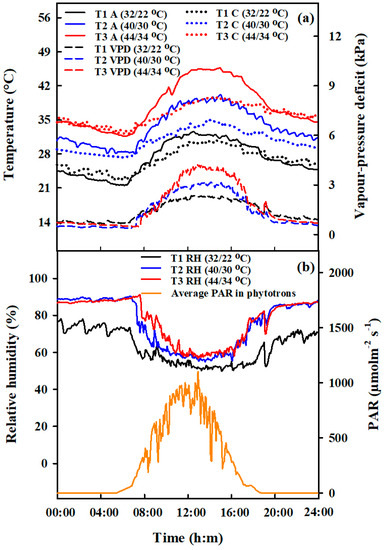 Diurnal variations of air (A, °C, solid lines, (a)—left vertical axis), and canopy temperature (C, °C, dotted lines, (a)—left vertical axis), vapor pressure deficit (VPD, kPa, dashed lines, (a)—right vertical axis), relative air humidity (RH, %, solid lines, (b)—left vertical axis) and average photosynthetically active radiation (PAR, μmolm−2 s−1, (b)—right vertical axis) in phytotrons during heat stress treatments in 2016.