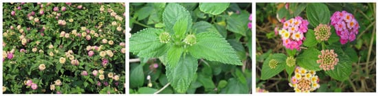Lantana camara L., which belongs to the family of Verbenaceae, is known as wild sage and red sage (Figure 1). It is a perennial shrub 1–4 m tall and forms dense stands. The leaves are opposite with long petioles, oval blades, hairy, and serrate. The species flowers all year round if the condition is adequate. A pair of inflorescences occurs at leaf axils. The flowers are small, multi-colored, and dense in flat-topped clusters. Each inflorescence bears 10–30 fruits, which are small, round drupes containing 1–2 seeds [1,2,3,4].