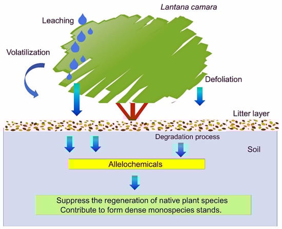 The formation of dense monospecies stands of L. camara, as described above, indicates its highly competitive ability with other plant species. Perennial plants may be able to release allelochemicals into the soil over several years, and those allelochemicals may accumulate in the soil under the trees [22,23,24,25,26,27]. According to the accumulated literature, L. camara possibly releases allelochemicals into the soil under its canopy. Those allelochemicals cause a reduction in seedling recruitment of the native plant species. Subsequently, L. camara forms dense monospecies stands. Therefore, allelopathy may play a crucial role in the L. camara invasion and formation of monospecies stands. The objective of this review is to discuss the possible involvement of allelopathy in the invasion and establishment of L. camara. This review paper provides an overview of the allelopathic property and allelochemicals of L. camara and discusses the importance of allelopathy for the invasion and formation of dense monospecies stands of L. camara.