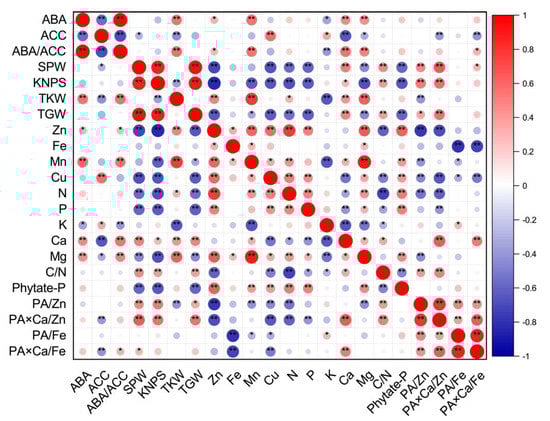 Corrplot representing correlation among measured grain phytohormones (concentrations of ABA and ACC, and ratios of ABA/ACC), grain yield traits and nutritional parameters (concentrations and ratios) of wheat crop across different soil Zn applications, cultivars and source–sink treatments (n = 48). Positive correlations are displayed in red and negative correlations are displayed in blue. The color legend on the right hand side of corrplot shows correlation coefficients and the corresponding colors. The intensity of the color and the circle size are proportional to the correlation coefficients. “*” and “**” indicate significant correlations at p ≤ 0.05 and p ≤ 0.01, respectively. The abbreviations are as follows: single panicle weight (SPW), kernel number per spike (KNPS), thousand kernel weight (TKW), total grain weight (TGW), concentrations of abscisic acid (ABA), the ethylene precursor 1-aminocylopropane-1-carboxylic acid (ACC), Zn, Fe, Mn, Cu, N, P, K, Ca, Mg and phytate-P, ratios of C/N and ABA/ACC, and molar ratios of phytic acid (PA)/Zn, PA × Ca/Zn, PA/Fe and PA × Ca/Fe in wheat grains.