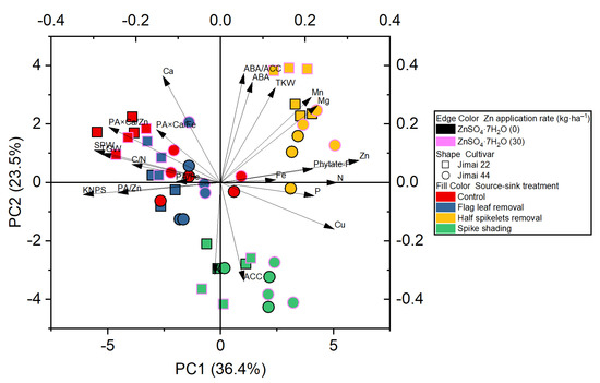 Principle component analysis (PCA) of the effect of source–sink manipulation on various investigated parameters of wheat plants. The abbreviations are as follows: single panicle weight (SPW), kernel number per spike (KNPS), thousand kernel weight (TKW), total grain weight (TGW), concentrations of abscisic acid (ABA), the ethylene precursor 1-aminocylopropane-1-carboxylic acid (ACC), Zn, Fe, Mn, Cu, N, P, K, Ca, Mg and phytate-P, ratios of C/N and ABA/ACC, and molar ratios of phytic acid (PA)/Zn, PA × Ca/Zn, PA/Fe and PA × Ca/Fe in wheat grains.