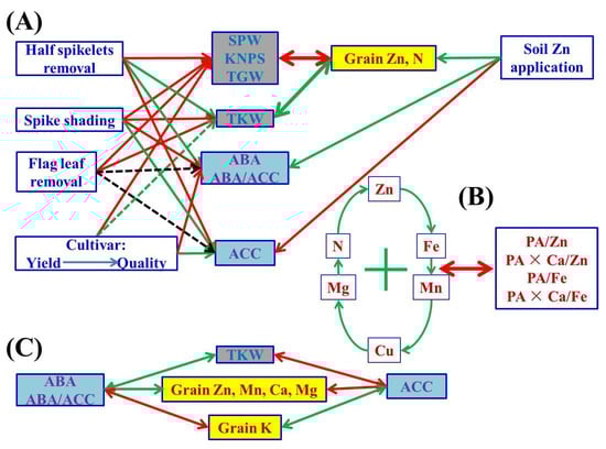 A schematic diagram summarizing possible cascades of grain phytohormones (concentrations of ABA and ACC, and ratios of ABA/ACC), grain yield traits and nutritional parameters (concentrations and ratios) of wheat crop affected by different soil Zn applications, cultivars and source–sink treatments. The one-way arrow in red indicates a decrease or negative influence, the one-way arrow in green indicates an increase or positive influence, and the two-way arrows in red and green colors indicate negative and positive correlation, respectively. “+” indicates mutual positive correlations among parameters. The dotted green line indicates weaker/less probability than the solid line; the black dotted line indicates an uncertain relationship. The abbreviations are as follows: single panicle weight (SPW), kernel number per spike (KNPS), thousand kernel weight (TKW), total grain weight (TGW), concentrations of abscisic acid (ABA), the ethylene precursor 1-aminocylopropane-1-carboxylic acid (ACC), Zn, Fe, Mn, Cu, N, P, K, Ca, Mg and phytate-P, ratios of C/N and ABA/ACC, and molar ratios of phytic acid (PA)/Zn, PA × Ca/Zn, PA/Fe and PA × Ca/Fe in wheat grains.