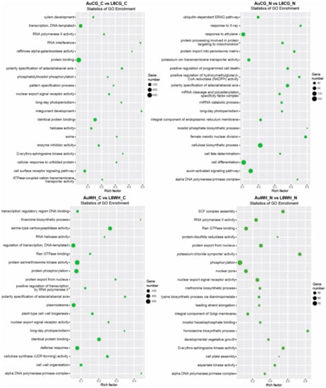 GO enrichment scatterplots of gene transcripts targeted by miRNAs responsive to the progeny N starvation factor. The treatment groups are: AuCG_C (DBA Aurora control parents, progeny treated with the control), AuCG_N (DBA Aurora control parents, progeny treated with N starvation), AuWH_C (DBA Aurora water-deficit and heat stress parents, progeny treated with the control), AuWH_N (DBA Aurora water-deficit and heat stress parents, progeny treated with N starvation), L6CG_C (L6 control parents, progeny treated with the control), L6CG_N (L6 control parents, progeny treated with N starvation), L6WH_C (L6 water-deficit and heat stress parents, progeny treated with the control), and L6WH_N (L6 water-deficit and heat stress parents, progeny treated with N starvation). Scatter dot size represents the number of targets annotated with a specific GO term. Rich factor represents the degree of enrichment (higher rich factor represents higher degree of gene enrichment).