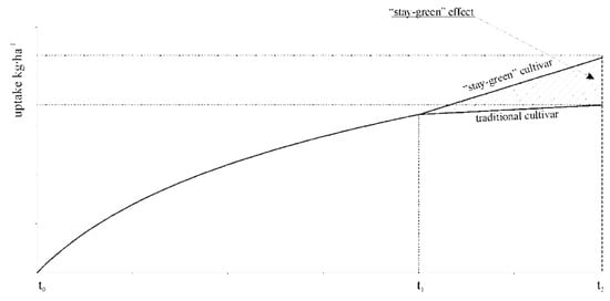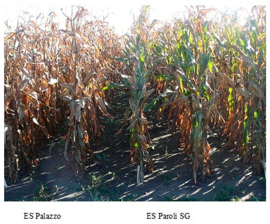 Balanced fertilization is the basic task of sustainable agriculture [1], which should take into account all the nutrients necessary for proper growth and development [2,3]. Ensuring the optimal level of plant growth factors, including nutrient availability, guarantees the accomplishment of the yield potential [4,5]. Maize (Zea mays L.) is characterized by a high ability to absorb nutrients that are used in mineral fertilization [2]. Therefore, doses of mineral fertilizers should correspond to the nutritional needs, taking into account the amount of components that can be taken up from the soil [6]. Some of the reasons for low maize yield are acidic soils, insufficient nutrient supply, as well as failure to adjust the fertilization system to quantitative needs, especially the dynamics of nutrient uptake by plants throughout the growing season [3]. Periodic water deficiencies in the soil (drought), frequent in growing seasons, limit the yield potential of new, often more fertile maize hybrids [7,8]. Due to unpredictable weather conditions, the creation of hybrids with advantages in an environment with limited water resources is one of the main challenges faced by breeders [9]. “Stay-green” maize hybrids belong to such varieties. This is the result of a better developed root system [10] and a faster initial growth dynamic [11]. Hence, breeding works should be focused on greater plant health in the later growing season [12] and/or on increasing leaf greenness, known as “stay-green” [13]. This trait is an indicator of good plant health, slower aging rate (Figure 1), and drought tolerance after flowering [14]. The “stay-green” trait shows a positive correlation with plant yielding [15,16]. However, the cause-and-effect relationship between these traits and grain yield is limited by the duration of the growing season and genetic basis of the cultivar under study [17,18].