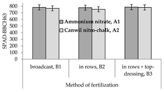 Mean values of SPAD-BBCH63 were larger for ammonium nitrate than for Canwil nitro-chalk in all three methods of fertilization (Figure 2).