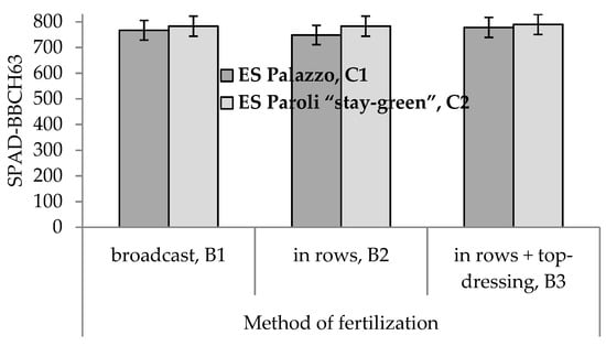 Mean values of SPAD-BBCH63 were larger for ES Paroli “stay-green” than for ES Palazzo in all three methods of fertilization (Figure 3).