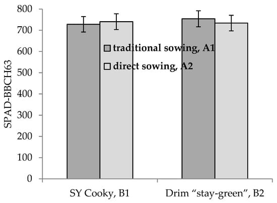 Analysis of variance indicated that the main effects of method of sowing, cultivar, method of fertilization and year × method of fertilization were statistically significant for SPAD-BBCH15/16 and yield in Experiment II (Table 1 and Table 5). Additionally, method of sowing × cultivar (Figure 4) and year × A interactions determined SPAD-BBCH63 (Table 1 and Table 5). Year × method of fertilization interaction was significant for SPAD-BBCH15/16 (Table 1).