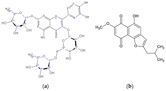 Chemical structure of quercetin 3-rutinoside-7-rhamnoside (a) and rinderol (b).