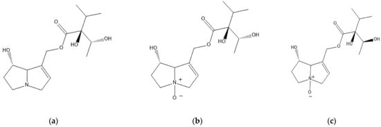 The structures of identified PA/PANOs: (a) echinatine, (b) echinatine N-oxide, (c) rinderine N-oxide.