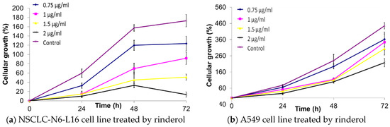 Result of continuous growth kinetics of NSCLC-N6-L16 (a) and the line A549 (b) cell lines after treatment with different concentrations of rinderol in a period of 72 h.