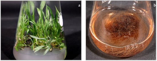 Rindera graeca in vitro culture: (a) shoots cultivated on solid DCR medium supplemented with BAP 0.5 mg/L; (b) hairy roots maintained in liquid DCR medium.