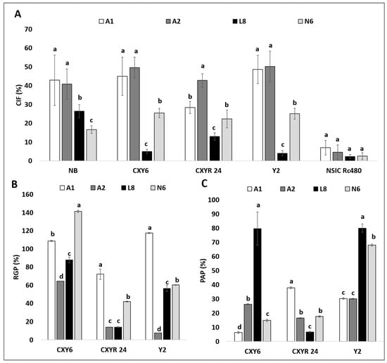 Callus induction frequency (CIF), green plantlet regeneration (RGP), and albino plantlet regeneration (PAP) of different genotypes in the tested media. (A) Comparison of callus induction frequency (CIF) of different genotypes incubated in the test media. (B) Comparison of green plantlet regeneration (RGP) of hybrids of indica × japonica incubated in the test media. (C) Comparison of the albino plantlet regeneration (PAP) of hybrids of indica × japonica incubated in the test media. The data presented are means of five replicates, and error bars represent SD. Values with different letter (a,b,c,d) per genotype are significantly different (Tukey HSD Test, p < 0.05, n = 5 replicates).