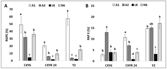 Plant regeneration efficiency of the different hybrids incubated in the test media. (A) Comparison of the green plantlet regeneration efficiency (RGPE) of 100 anthers from the hybrids of indica × japonica incubated on the tested media. (B) Comparison of the albino plantlet regeneration efficiency (PAPE) of the 100 anthers from the hybrids of indica × japonica incubated on the test media. The data presented are means of five replicates, and error bars represent SD. Values with different letter (a,b,c,d) per genotype are significantly different (Tukey HSD Test, p < 0.05, n = 5 replicates).