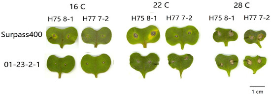 Lesion development from six pairs of Brassica napus cotyledon–Leptosphaeria maculans isolate inoculation: Surpass400–HCRT75 8-1/HCRT77 7-2 and 01-23-2-1–HCRT75 8-1/HCRT 77 7-2 at 11 days post-inoculation (dpi) with three temperature treatments: 16 °C/10 °C, 22 °C/16 °C, and 28 °C/22 °C (day/night: 16 h/8 h). Bar = 1cm.