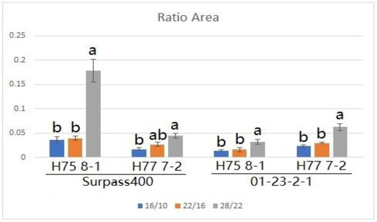 The extent of blackleg lesion development at 11 dpi from Surpass400 and 01-23-2-1 inoculated by the isolates HCRT75 8-1 and HCRT77 7-2. The inoculated plants were exposed to three temperature treatments: 16 °C/10 °C, 22 °C/16 °C and 28 °C/22 °C (day/night: 16 h/8 h). The lesion development was calculated by the ratio between the area of the lesion and the area of the cotyledon. Error bars represent standard error of the mean. Different lowercase letters suggest the significant differences among mean values (Fisher’s Least Significant Difference; p < 0.05). The results are based on three replicates in three independent experiments.