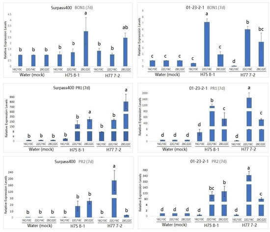 Gene expression of BONZAI1 (BON1), PATHOGENESIS-RELATED (PR)1 and PATHOGENESIS-RELATED (PR)2 (in B. napus) in the regulation of hormonal signals at 11 dpi from Surpass400 and 01-23-2-1 inoculated by the blackleg isolates HCRT75 8-1 and HCRT77 7-2. The inoculated plants were exposed to three temperature treatments: 16 °C/10 °C, 22 °C/16 °C and 28 °C/22 °C (day/night: 16 h/8 h). The levels of the bars are the expression levels obtained from the inoculated cotyledons (inoculated by H75 8-1 and H77 7-2) compared to the cotyledons inoculated with water (assuming that the expression of each studied gene in the cotyledons inoculated with water is 1). Error bars represent standard error of the mean. Different lowercase letters suggest the significant differences among mean values (Fisher’s Least Significant Difference; p < 0.05). The results are based on three replicates in three independent experiments.