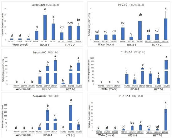 Studies have suggested that BON genes are related to the growth/defense balance at a low temperature (22 °C), and BON1 has been found to play a dominant role in repressing the plant defense [11,15]. As can be seen by the expression of BON1 in Figure 3, BON1 was more pronounced at the 22 °C/16 °C condition compared with the other two conditions at 7 dpi. Similar to at 7 dpi, BON1 was still induced at 11 dpi when the plant was treated with the 28 °C/22 °C condition (Figure 4). Moreover, Surpass400–H75 8-1/H77 7-2 maintained a pronounced up-regulation in all three conditions at 11 dpi, while 01-23-2-1–H75 8-1 appeared to have higher levels of BON1 at 16 °C/10 °C than at 22 °C/16 °C. Additionally, the gene also exhibited a high level of induction at 28 °C/22 °C.