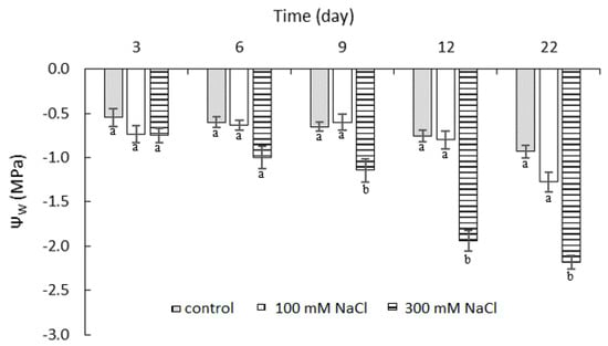 Salinity reduced the leaf water potential in both experimental treatments (Figure 1). For the 300 mM NaCl treatment, the water potential values ranged from −0.75 to −2.18 MPa. The reduction in leaf water potential was observable from the sixth day of salt stress exposure and was statistically significant relative to control from the ninth day of salt treatment. The water potential decreased rapidly between the 9th and 12th day of salt exposure. For the 100 mM NaCl treatment, the water potential decreased at the end of the experiment, but throughout the experiment, the water potential values were not significantly different from the control.