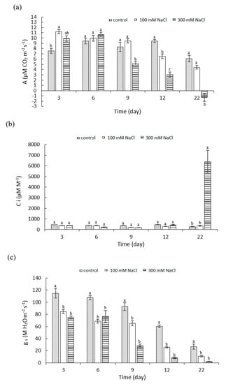 Changes in CO2 assimilation were measured after all treatments (Figure 2a). On the third day of saline stress exposure, the rate of photosynthesis was significantly increased with 100 mM NaCl compared to control, from 7.58 to 11.21 µM CO2 m−2 s−1. A significant decrease in photosynthetic CO2 assimilation of 38% under 300 mM NaCl treatment was measured from day 9 of stress, in comparison to the control. In the final stages of the experiment (stress day 22), negative values of CO2 assimilation (−1.29 µM CO2·m−2 s−1) were measured. At a salinity of 100 mM NaCl, the CO2 assimilation was significantly reduced on stress day 12 compared to control; at the end of the experiment; however, there was no significant difference between control and 100 mM NaCl exposure.