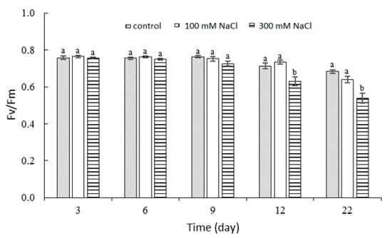 For the 100 and 300 mM NaCl treatments, no significant differences were measured in the values of the maximum quantum yield of PSII (Fv/Fm), compared to the control at up to day 9 of stress. A progressive decrease in the maximum quantum yield of the PSII photosystem occurred from day 9 (0.73) until the end of the experiment (0.54) with 300 mM NaCl exposure. Throughout the experiment, there were no significant differences between the control and 100 mM NaCl (Figure 4).