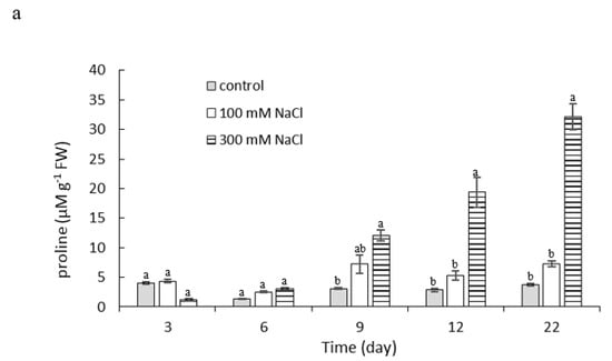 By the sixth day of salt stress exposure, no significant differences in the free proline content in the leaves of the experimental samples were seen compared to control. A significant progressive increase in free proline content in the leaves was recorded for the 300 mM NaCl treatment from exposure on day 9 until the end of the experiment. The free proline content on day 22 of stress exposure at this salinity was 32.12 µM g−1 FW (fresh weight), which is almost 11 times higher than the proline content on day 6 (3.03 µM g−1 FW). The content of free proline in the 100 mM NaCl variant ranged from 2.54 to 7.24 µM ·g−1 FW throughout the experiment and there was no significant difference relative to control (Figure 5a).