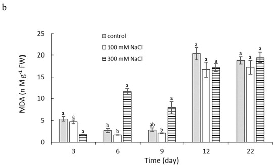 At the initial stages of stress exposure, the differences in MDA level between the salinity treatments were inconclusive. A significantly higher MDA content compared to the control group was seen with the 300 mM NaCl treatment on days 6 and 9 of stress exposure (11.62 and 7.89 nM g−1 FW, respectively). For the rest of the experiment, no significant differences between the saline treatments were seen. A common trend for all treatments was an increase in MDA at the end of the experiment (Figure 5b). The PCA results (Figure 3b) showed a close relationship between proline content and high salt concentration, as well as a negative correlation between proline content and water potential (r = 0.938).