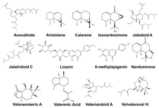 The calyx can be completely lacking as in some Valeriana species, reduced to small teeth as in Fedia and Valerianella, leafy and persistent as in Nardostachys, or pappus-like and featherly as in some Valeriana species and in Centranthus. The genera of this sub-family include Valeriana L., Centranthus Lam. and DC., Fedia Gaertn., Patrinia Juss., Nardostachys DC., Plectritis (Lindl.) DC., and Valerianella Mill. Phytochemical studies revealed the presence of sesquiterpenes, valepotriates, alkaloids, flavonoids, organic acids, and their derivatives, as characteristic classes of constituents in Valerianaceae plants [3,4,5]. It is generally accepted that valepotriates are common in Valerianaceae species and are responsible for their sedative properties. The present review is designed to report the current knowledge on the plant species that belong to the sub-family Valerianaceae, their phytochemicals, and their uses in the treatment of several diseases with particular emphasis to the action on the central nervous system (CNS). All collected data have been obtained from different databases such as PubMed, Scopus, Sci Finder, Web of Science, Science Direct, NCBI, and Google Scholar.