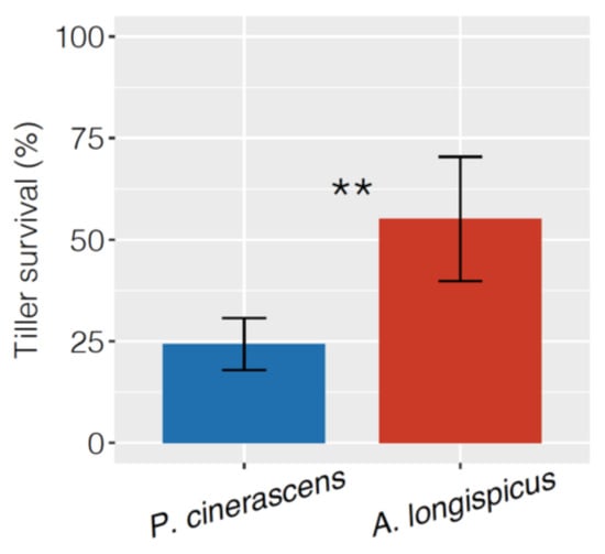 Vegetative propagation of Paspalum cinerascens and Axonopus longispicus. Percentage of tiller survival after 30 days of growth in controlled conditions (see Materials and Methods). The error bars represent the means and confidence intervals at p < 0.05 (n = 8 plots with 25 tillers each). ** represents significant differences after Student’s t-test at p < 0.01.