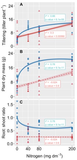 All data analyses were conducted in R version 3.5.2 []. Differences in the tillering survival rates between the two species were tested using one-way analysis of variance (ANOVA) followed by subsequent Student’s t-test. Calibration curves of all variables versus nitrogen levels were generated using a simple linear regression analysis (glm() function) in the R environment. When applicable, the optimum N level was estimated after the model derivation was completed. The figures were built using the ggplot package.