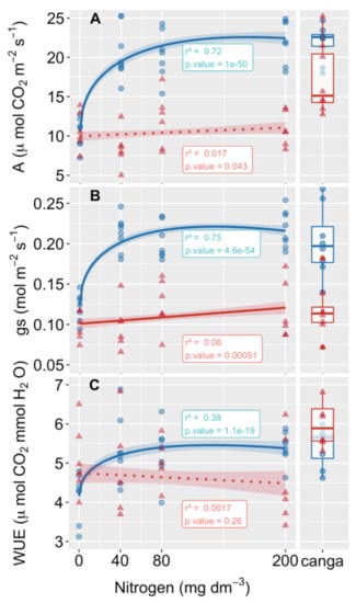 Effects of nitrogen increases in the mining waste substrates on the leaf gas exchanges of two native grass species from canga in Serra dos Carajás (eastern Amazon). The carbon assimilation rates (A), stomatal conductance (B), and water use efficiencies (C) of Paspalum cinerascens (blue) and Axonopus longispicus (red) are shown. The lines correspond to the best fitted model, and the shaded areas correspond to the confidence intervals. The solid and dotted lines indicate significant and non-significant models, respectively. The r-squared value and p-value are shown in the boxes close to each model and the other regression parameters are shown in the Tables S2 and S3. The boxplots correspond to measurements carried out on field-growing plants on the canga plateau N1 of Serra dos Carajás.