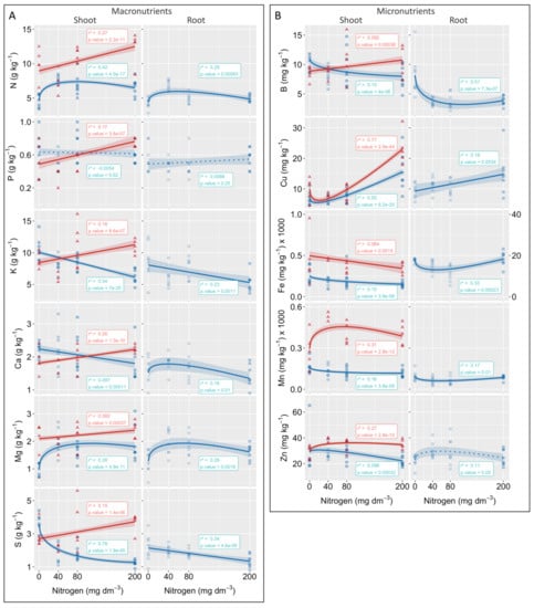 Effects of nitrogen increases in the mining waste substrates on the shoot and root nutrient contents of two native grass species from canga in Serra dos Carajás (eastern Amazon). The macro- (A) and micronutrients (B) of Paspalum cinerascens (blue) and Axonopus longispicus (red) are shown. The nutrient contents were not determined in the roots of A. longispicus because of the lower biomasses obtained in all treatments. The lines correspond to the best fitted model, and the shaded areas correspond to the confidence intervals. The solid and dotted lines indicate significant and non-significant models, respectively. The r-squared value and p-value are shown in the boxes close to each model and the other regression parameters are shown in Tables S2 and S3.
