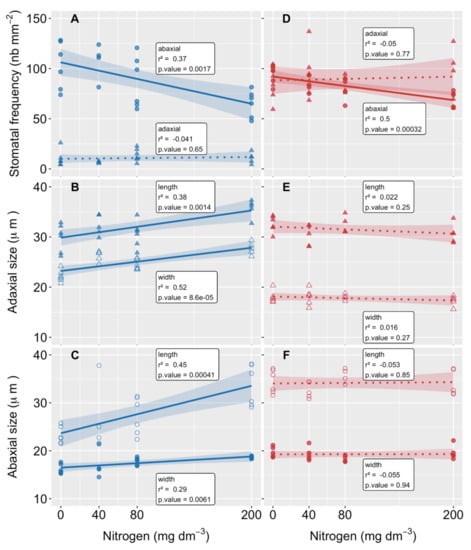 Nitrogen effects on the leaf stomatal morphologies of two native grass species from canga in Serra dos Carajás (eastern Amazon) grown on mining waste substrates. The stomatal frequency (A,D) and stomatal size (length and width) on the adaxial (B,E) and abaxial (C,F) leaf surfaces of Paspalum cinerascens (blue) and Axonopus longispicus (red) are shown. The lines correspond to the best fitted model, and the shaded area corresponds to the confidence intervals. The regression parameters are shown in Tables S2 and S3.