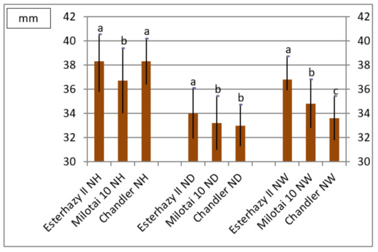 Nut size is an important feature in the descriptions of walnut varieties and genotypes. Nut height of “Esterhazy II” and “Chandler” were equivalent and differed significantly from “Milotai 10”. The most important characteristic is the nut diameter; “Esterhazy II” reached the significantly largest value among the observed varieties. Again, in the case of nut width, “Esterhazy II” produced the significantly largest value among the examined cultivars (Figure 1).