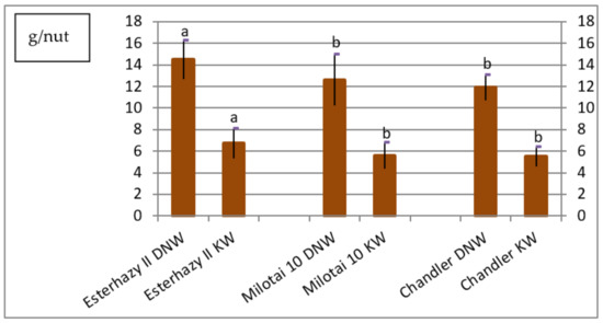 One main aim of walnut breeding is to obtain higher nut production; in other words, many nuts with good nut weight. In our experiment, the dried whole nut weights varied between 11.9 and 14.5 g/nut. The kernel weight was in the range of 5.5 and 6.7 g/kernel. The highest dried nut and kernel weights were measured in the case of “Esterhazy II”; both parameters were significantly higher than the measured values of the other two varieties (Figure 2).