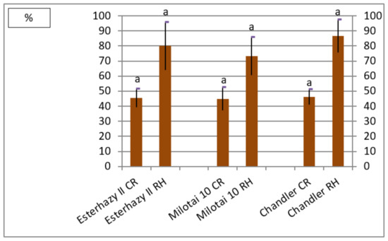 Cracking rate (CR) and the ratio of halves (RH) of Esterhazy II, Milotai 10 and Chandler (2010–2019) (SD5% CR = 2.1, SD5%RH = 14.2). Varieties being not significantly different from each other at SD5% are indicated with the same letter.