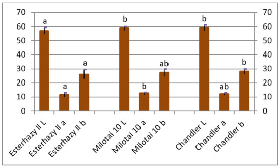 Shell and kernel color, especially lightness, is an important feature from the aspect of market value. L values of “Chandler” and “Milotai 10” were significantly higher compared to “Esterhazy II”. The “a” values of “Milotai 10” were the highest and showed a significant difference from “Esterhazy II”. The “b” values of “Chandler” were statistically different from “Esterhazy II” (Figure 4).