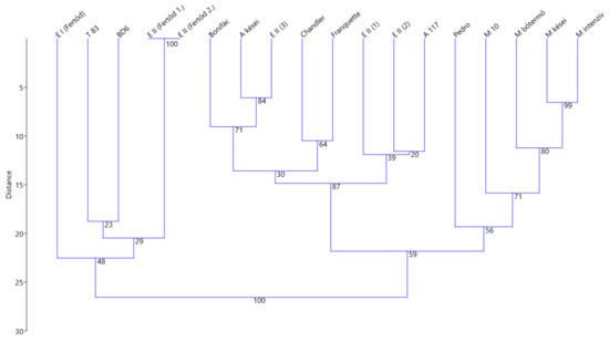 For SSR data analysis, GenAlEx 6.5 software [39,40] was used. The probability of identity (PID) was calculated for combining the analyzed eight loci by GenAlEx 6.5., possible matching genotypes were checked. The genetic distance matrix was generated by GenAlEx 6.5 for the construction of an UPGMA dendrogram by PAST 4.03 [41] with 9999 bootstrap replicates.