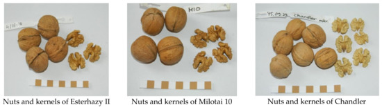 According to the literature, nuts of “Esterhazy II” have an ovate shape (“egg shape”) with a medium-long tip [19,20,21,22,23,24]. Measurements made in this trial are following this information, as our genotype provided the highest values of nut height and nut diameter (Figure 1 and Figure S2). Nuts from our samples reached the nut height and diameter described in the literature [19,20,21,22,23,24]. Thus, the examined genotype from our gene bank may be true to “Esterhazy II,” also based on the fruit size data.