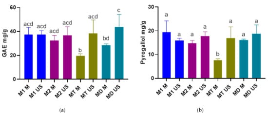 (a) Total polyphenol content (TPC) of spruce bark extracts; (b) total tannin content (TTC) of spruce bark extracts; significant differences are represented by different letters (significance level α = 0.05); M1 US—P. abies (Maramureșului Mountains National Park site 1) extract produced by UAE, M2 US—P. abies (Maramureșului Mountains National Park site 2) extract produced by UAE, MT US—P. abies (Tașca) extract produced by UAE, MD US—P. abies (Dolhasca) extract produced by UAE, M1 M—P. abies (Maramureșului Mountains National Park site 1) extract produced by MAE, M2 M—P. abies (Maramureșului Mountains National Park site 2) extract produced by MAE, MT M—P. abies (Tașca) extract produced by MAE and MD M—P. abies (Dolhasca) extract produced by MAE.