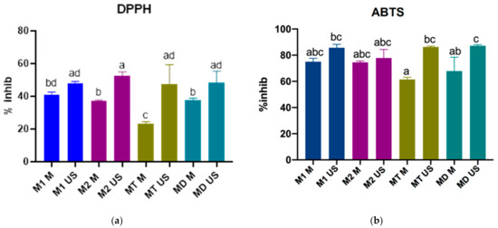 (a) Antioxidant capacity (AC) assessed by the DPPH method; (b) antioxidant capacity (AC) assessed by the ABTS method; significant differences are represented by different letters (significance level α = 0.05); M1 US—P. abies (Maramureșului mountains national park site 1) extract produced by UAE, M2 US—P. abies (Maramureșului Mountains National Park site 2) extract produced by UAE, MT US—P. abies (Tașca) extract produced by UAE, MD US—P. abies (Dolhasca) extract produced by UAE, M1 M—P. abies (Maramureșului Mountains National Park site 1) extract produced by MAE, M2 M—P. abies (Maramureșului Mountains National Park site 2) extract produced by MAE, MT M—P. abies (Tașca) extract produced by MAE and MD M—P. abies (Dolhasca) extract produced by MAE.
