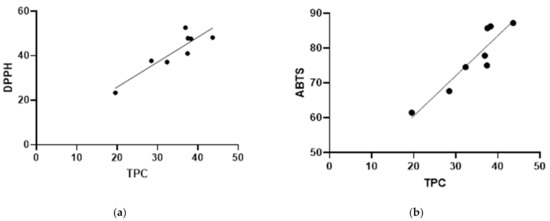 (a) Correlation between the TPC and inhibition percentages (DPPH assay) R2 = 0.8006; (b) Correlation between the TPC and inhibition percentages (ABTS assay) R2 = 0.8484.