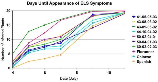Comparing the time to development of early leaf spot symptoms to progression of early leaf spot suggested that the Spanish checks developed symptoms later than the resistant introgression lines (Table 3, Figure 1), but once disease had infected the plants, disease progressed faster in the susceptible materials (Figure 2). It should be noted that at least two of the early leaf spot ratings were taken at dates later than those used for scoring for the appearance of disease symptoms, depending on environment and timing of the onset of disease symptoms. In this case, by the time that the Florida scale ratings were taken, all the plants in a plot had disease symptoms.